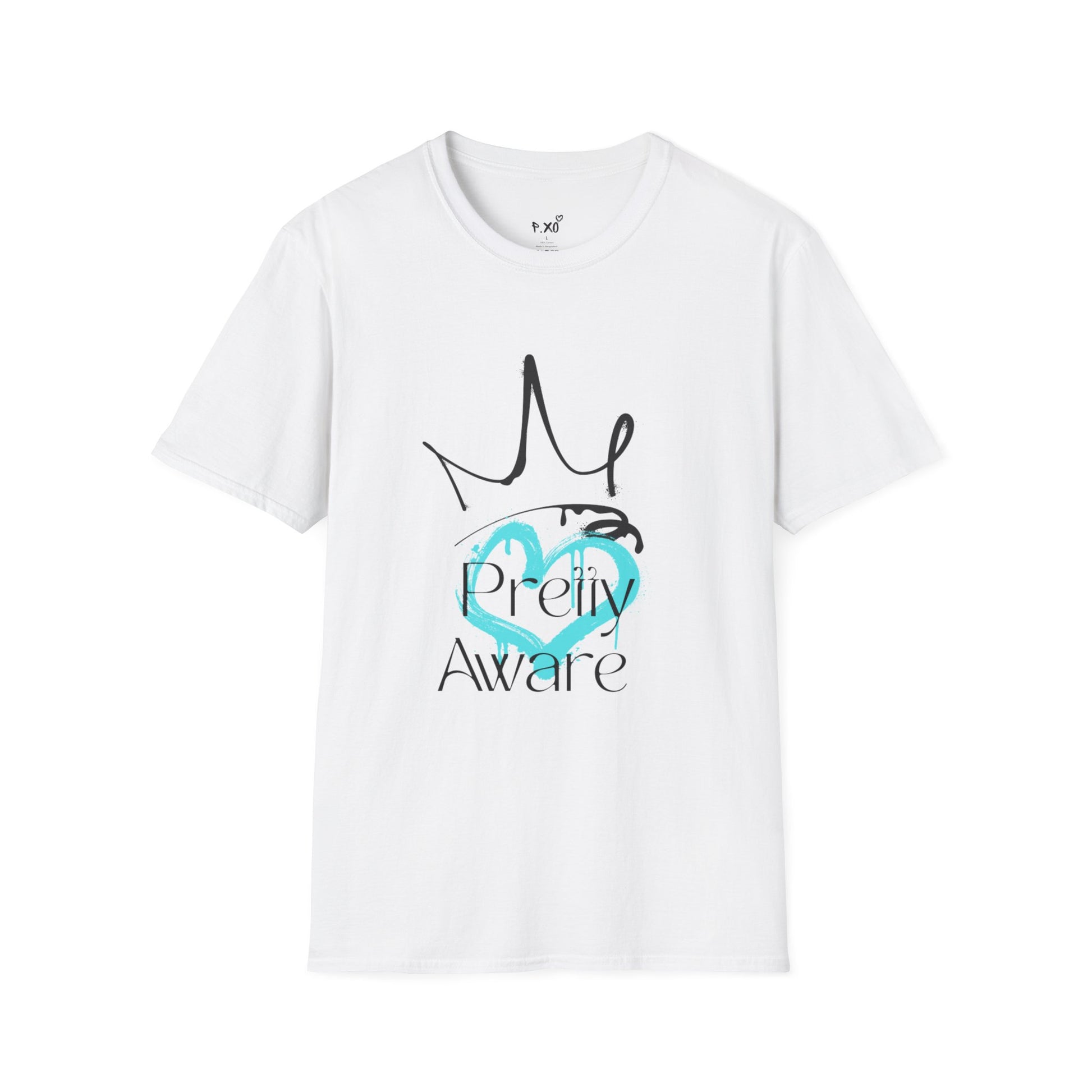 A lightweight, comfortable tee that speaks softly and confidently. This crew-neck shirt features a hand-drawn crown and teal heart motif with the phrase “Pretty Aware” layered beneath — a quiet declaration of self-respect and gentle strength. The smooth, ring-spun cotton feels breathable against the skin, while the tear-away label keeps the neckline irritation-free. Wear it on mornings when you want low-key style with a thoughtful message, or pair it with a cardigan or denim jacket for relaxed, intentional outfits.